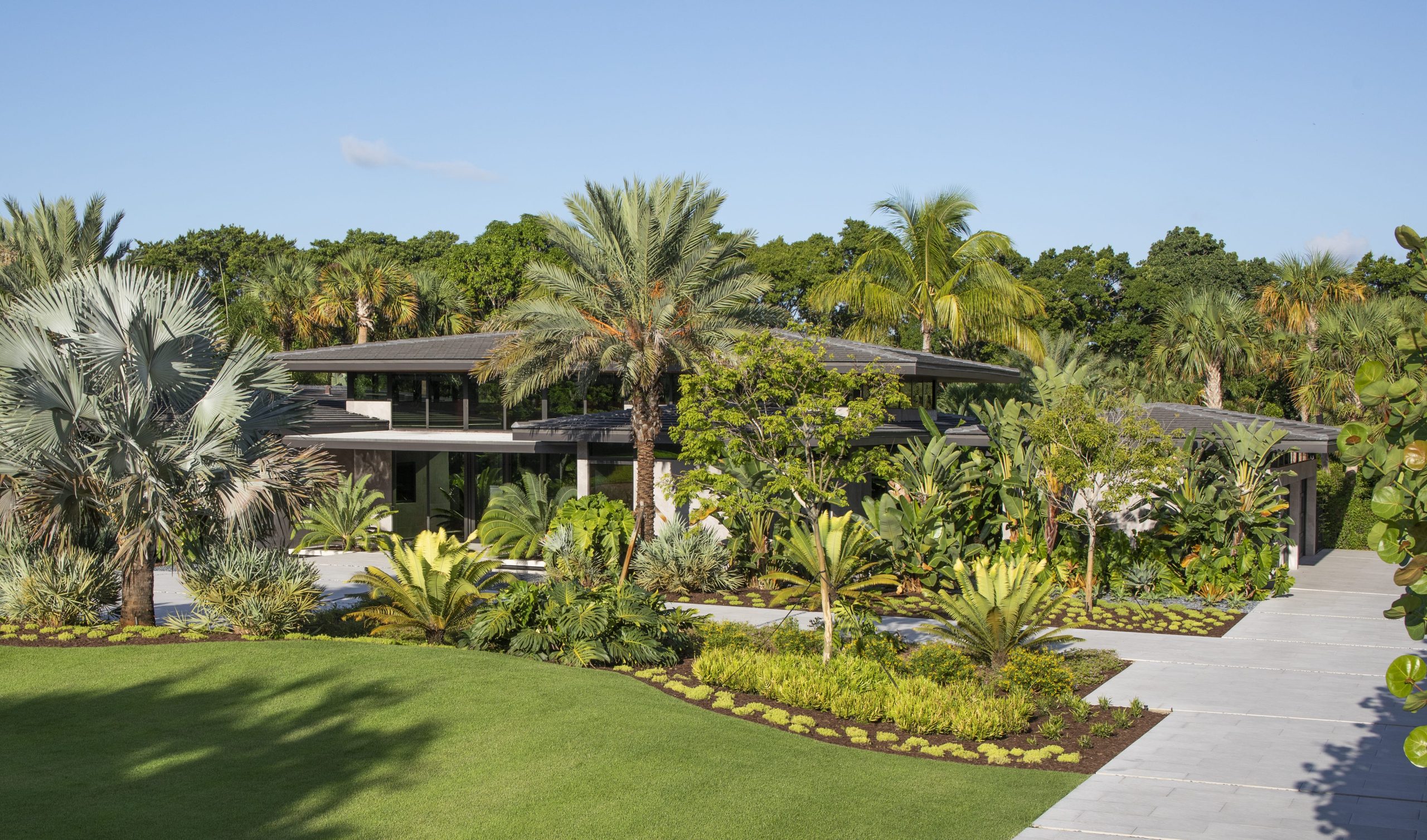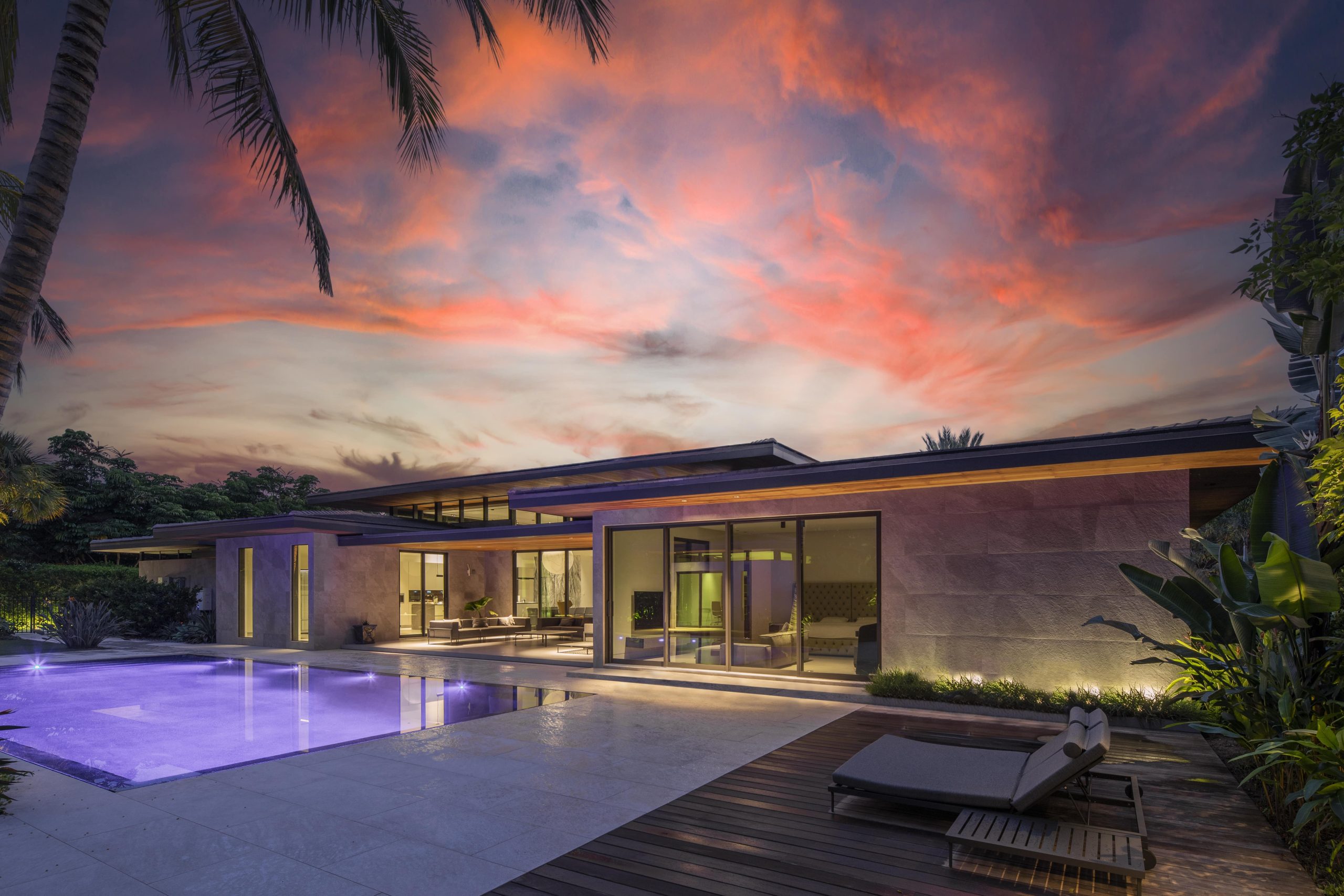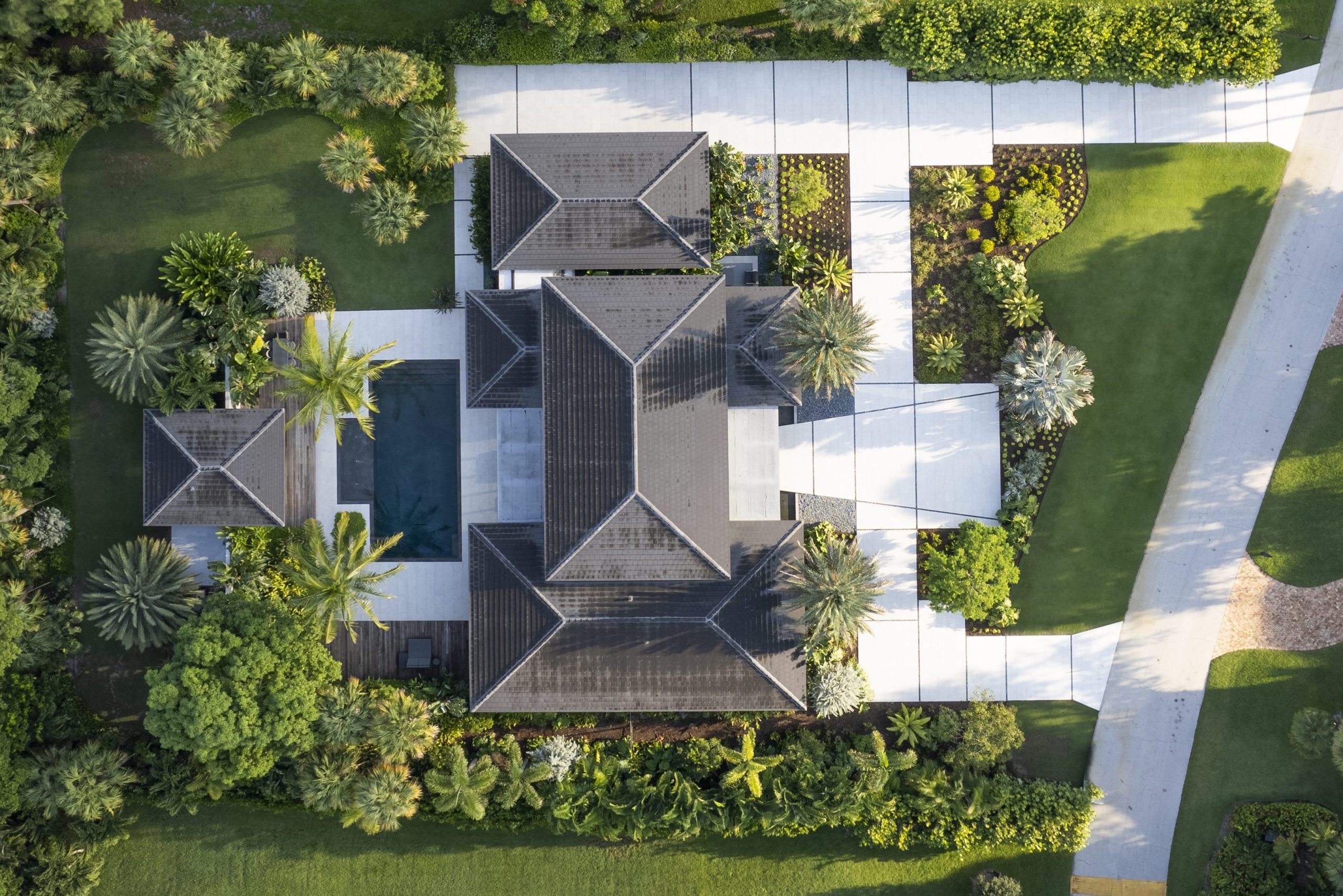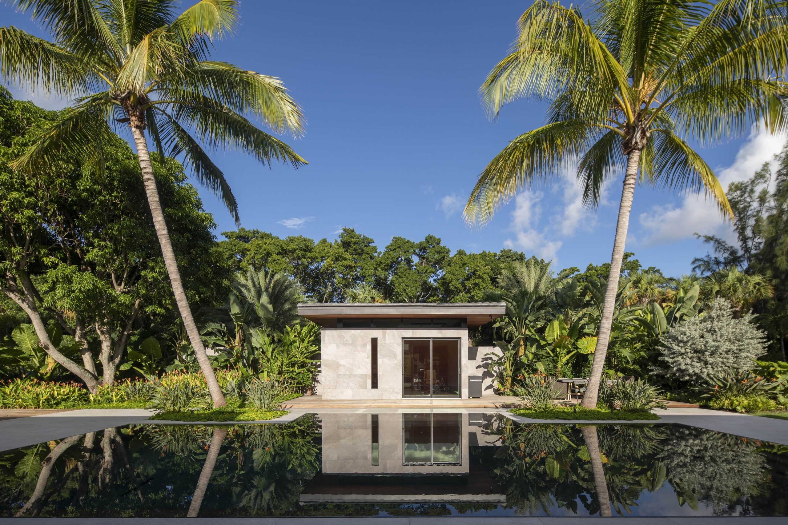 The site plan is organized around four main pavilions: A bedroom pavilion to the south, a cabana pavilion to the west, a garage pavilion to the north, and a central living pavilion. Each of the three pavilions engage with the central living space while still allowing nature to flow between them. The pavilions are organized around the pool deck, equipped with zero-edge detailing and layered subtropical landscaping. In this way the swimming pool doubles as a recreational component to the program but also as a mirror to expand views and reflect the surrounding landscape. A glass bridge serves as the garden threshold between the garage and the home.