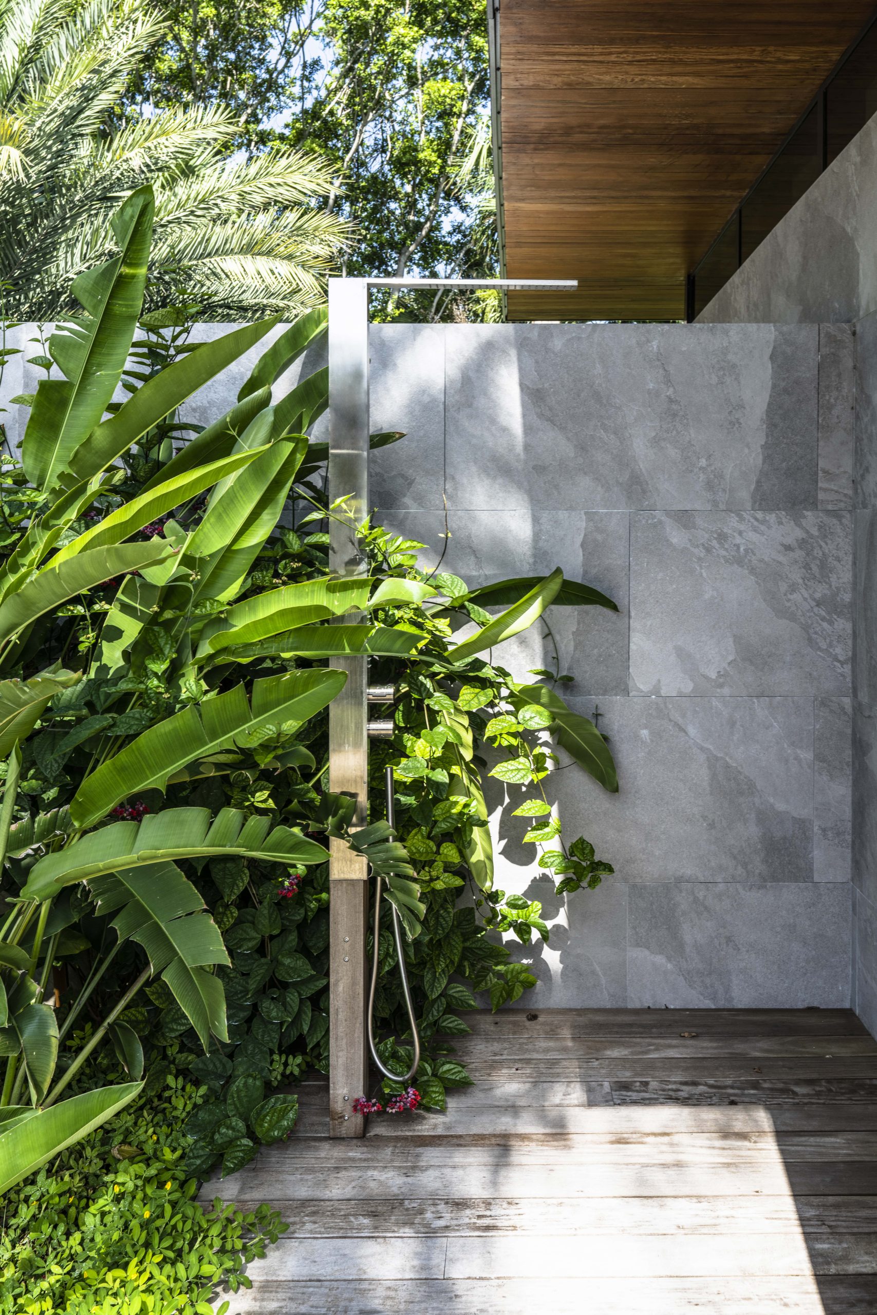 Architectural strategies included dematerializing the surrounding walls and expanding the roof eaves to connect the interior spaces with the surrounding gardens of the home.